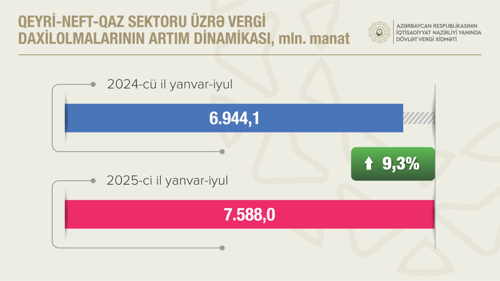 Qeyri-neft-qaz sektorunda daxilolmalar 7 milyard 588 milyon manatdan çox olub, proqnoz 103,4 faiz icra edilib. Əvvəlki ilin eyni dövrünə nisbətən bu sektordan vergi daxilolmaları 643,9 milyon manatdan və ya 9,3 faiz çox olub. Ödənilən vergilərin 71,9 faizi qeyri-neft-qaz sektorunun, 28,1 faizi isə neft-qaz sektorunun payına düşüb.