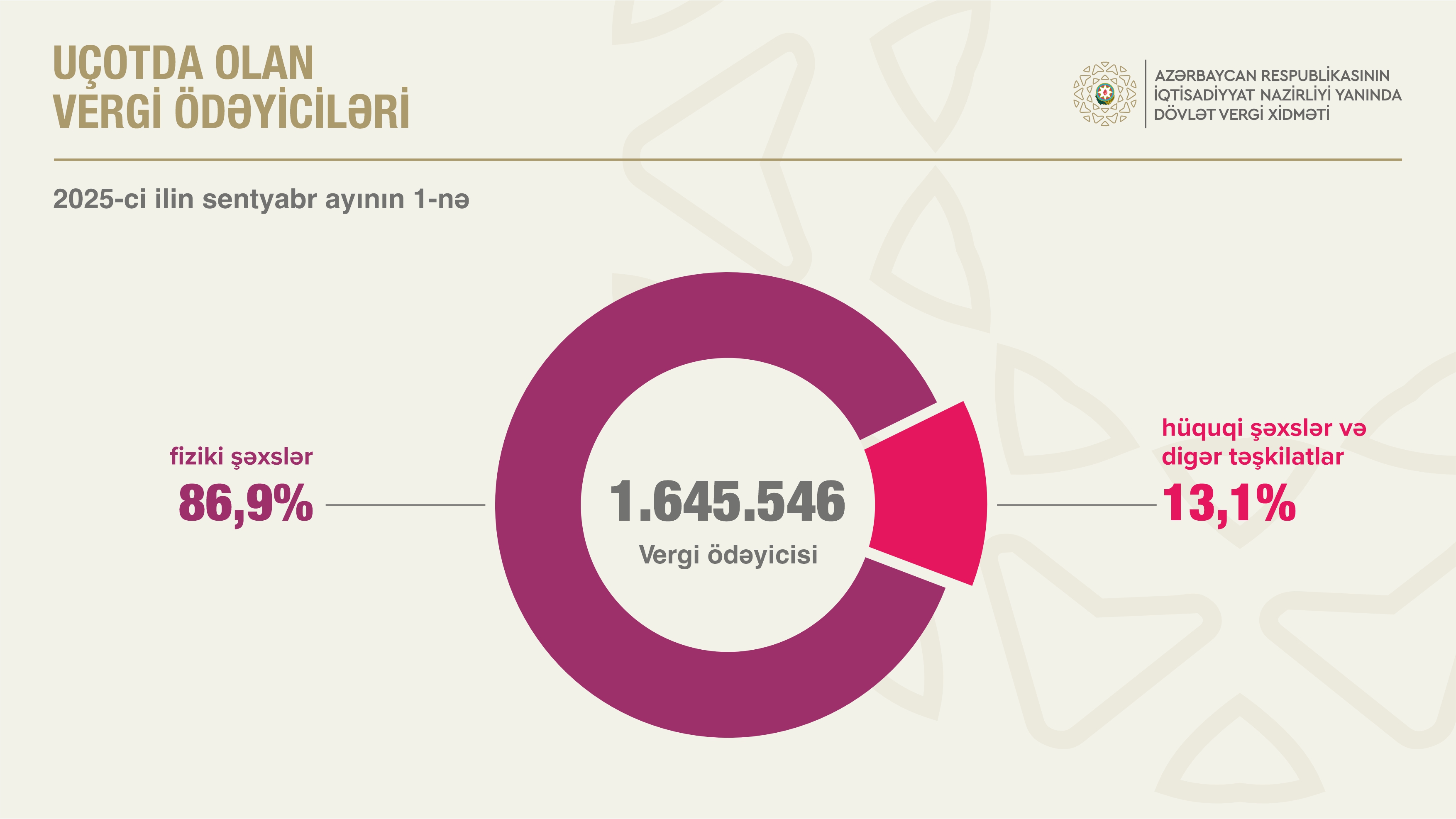 2025-ci ilin sentyabr ayının 1-nə respublika üzrə uçotda olan 1.645.546 vergi ödəyicisinin 86,9 faizi fiziki şəxs, 13,1 faizi hüquqi şəxs və digər təşkilatlar olub. Ötən ilin müvafiq dövrü ilə müqayisədə vergi ödəyicilərinin ümumi sayı 4,8 faiz, o cümlədən fiziki şəxslərin sayı 4,4 faiz, hüquqi şəxslərin sayı 7,3 faiz artıb.