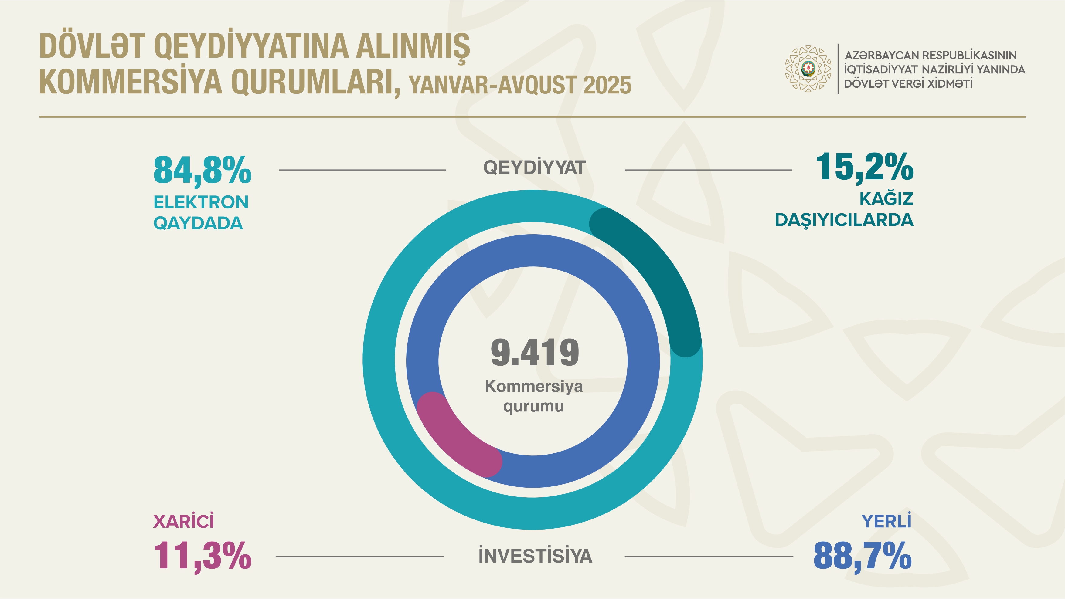Sentyabr ayının 1-nə qeydiyyatda olan kommersiya qurumlarının sayı ötən ilin müvafiq dövrü ilə müqayisədə 8 faiz artaraq 199.530 vahid təşkil edib. 2025-ci ilin yanvar-avqust aylarında 9.419 vahid kommersiya qurumu dövlət qeydiyyatından keçib ki, bunun da 88,7 faizi yerli investisiyalı, 11,3 faizi xarici investisiyalıdır.