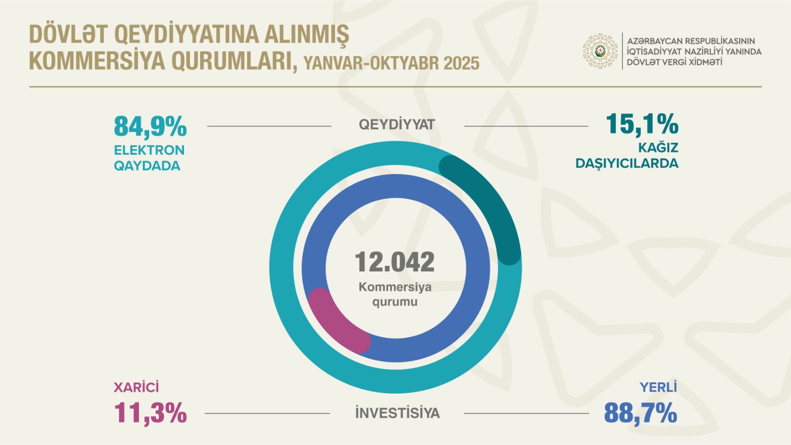 Noyabr ayının 1-nə qeydiyyatda olan kommersiya qurumlarının sayı 2024-cü ilin eyni dövrünə nisbətən 7,7 faiz artaraq 202.088 vahid təşkil edib. 2025-ci ilin yanvar - oktyabr aylarında 12.042 kommersiya qurumu dövlət qeydiyyatından keçib ki, onların 88,7 faizi yerli investisiyalı, 11,3 faizi isə xarici investisiyalıdır.