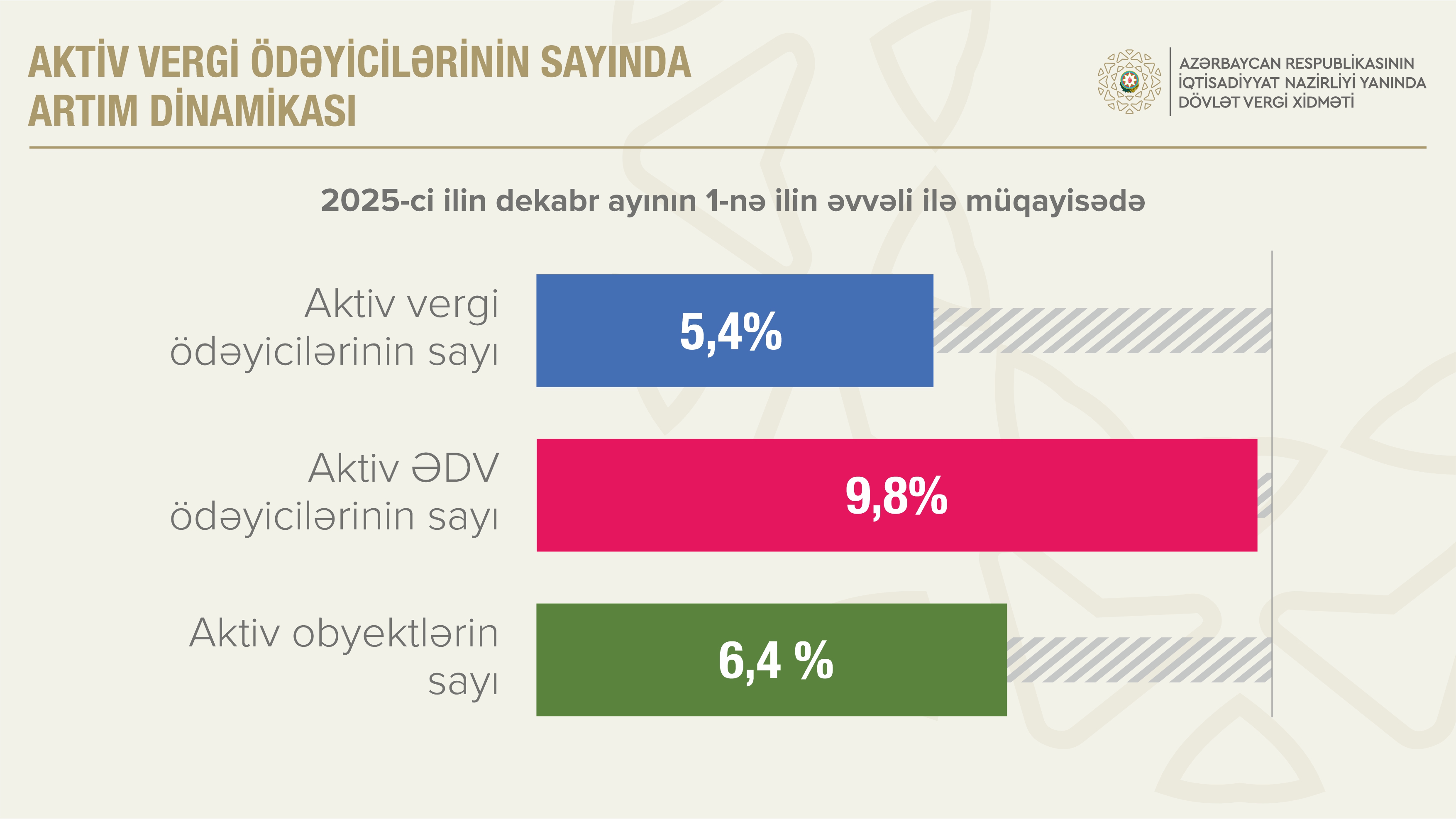 2025-ci il dekabrın 1-nə Azərbaycanda aktiv vergi ödəyicilərinin sayı ilin əvvəli ilə müqayisədə 5,4 faiz artaraq 850,9 min, aktiv ƏDV ödəyicilərinin sayı 9,8 faiz artaraq 57,9 min olub. Həmin tarixə aktiv təsərrüfat subyektlərinin (obyektlərinin) sayı 6,4 faiz artıb və 231,3 min təşkil edib.