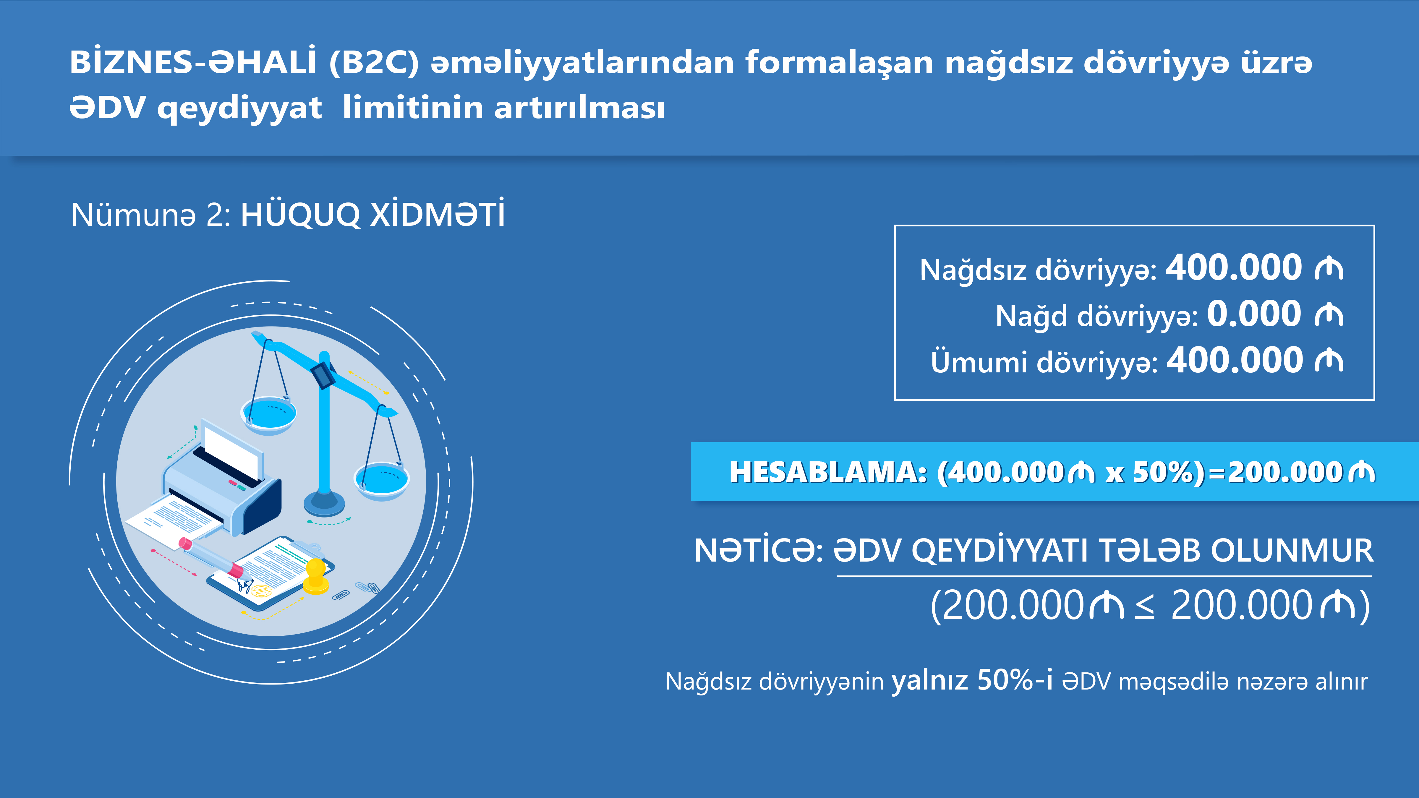 Vətəndaşlara hüquq xidməti göstərən şirkət ardıcıl 12 aylıq dövr ərzində yalnız POS-terminal vasitəsilə nağdsız satış əməliyyatları həyata keçirib və şirkətin həmin əməliyyatlar üzrə 400 min manat məbləğində dövriyyəsi formalaşıb. Fərdi sahibkarın ardıcıl 12 ay üzrə ümumi dövriyyəsi 400 min manat olsa da, Vergi Məcəlləsinə nəzərdə tutulan dəyişikliyə uyğun olaraq, POS-terminal vasitəsilə nağdsız qaydada aparılan əməliyyatlar nəticəsində ƏDV məqsədləri üçün hesablanan dövriyyə 200 min manat məbləğində müəyyən ediləcək. Bu halda, vergi tutulan dövriyyə məbləği məcburi ƏDV qeydiyyat həddi olan 200.000 manatı keçmədiyi üçün fərdi sahibkarın ƏDV məqsədləri üçün qeydiyyata alınmaq öhdəliyi yaranmır.