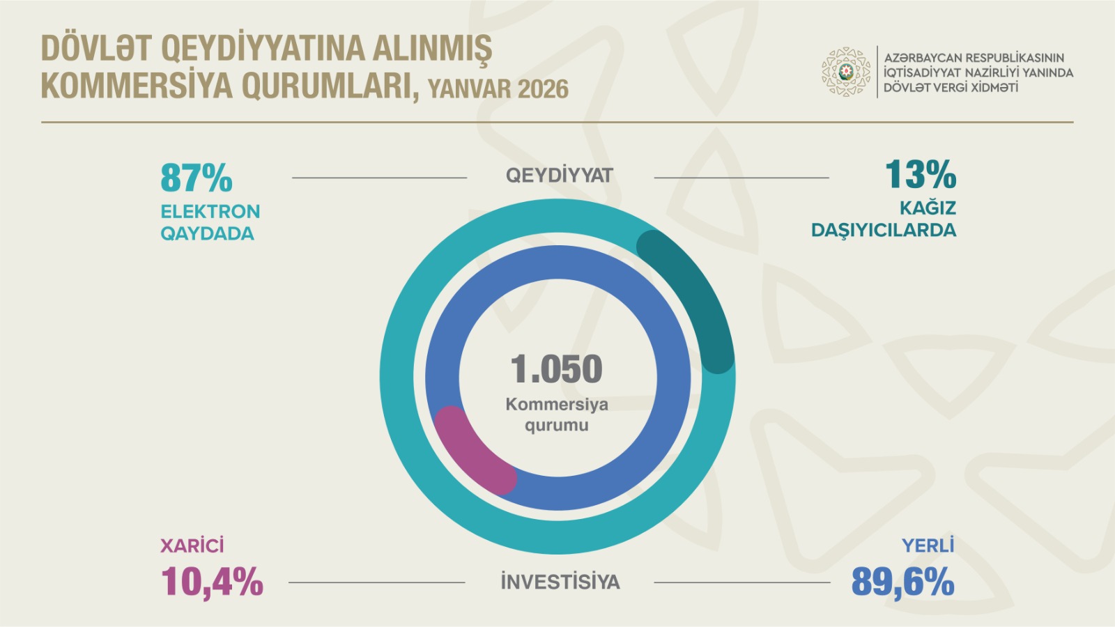 2026-cı ilin yanvar ayında 1.050 vahid kommersiya qurumu dövlət qeydiyyatından keçib ki, onların 89,6 faizi yerli investisiyalı, 10,4 faizi isə xarici investisiyalıdır. Kommersiya qurumlarının 87 faizi elektron qaydada qeydiyyata alınıb. 2026-cı ilin yanvar ayında qeydiyyatdan keçmiş yerli investisiyalı məhdud məsuliyyətli cəmiyyətlərin e-qeydiyyatının xüsusi çəkisi isə 97,6 faiz təşkil edib.