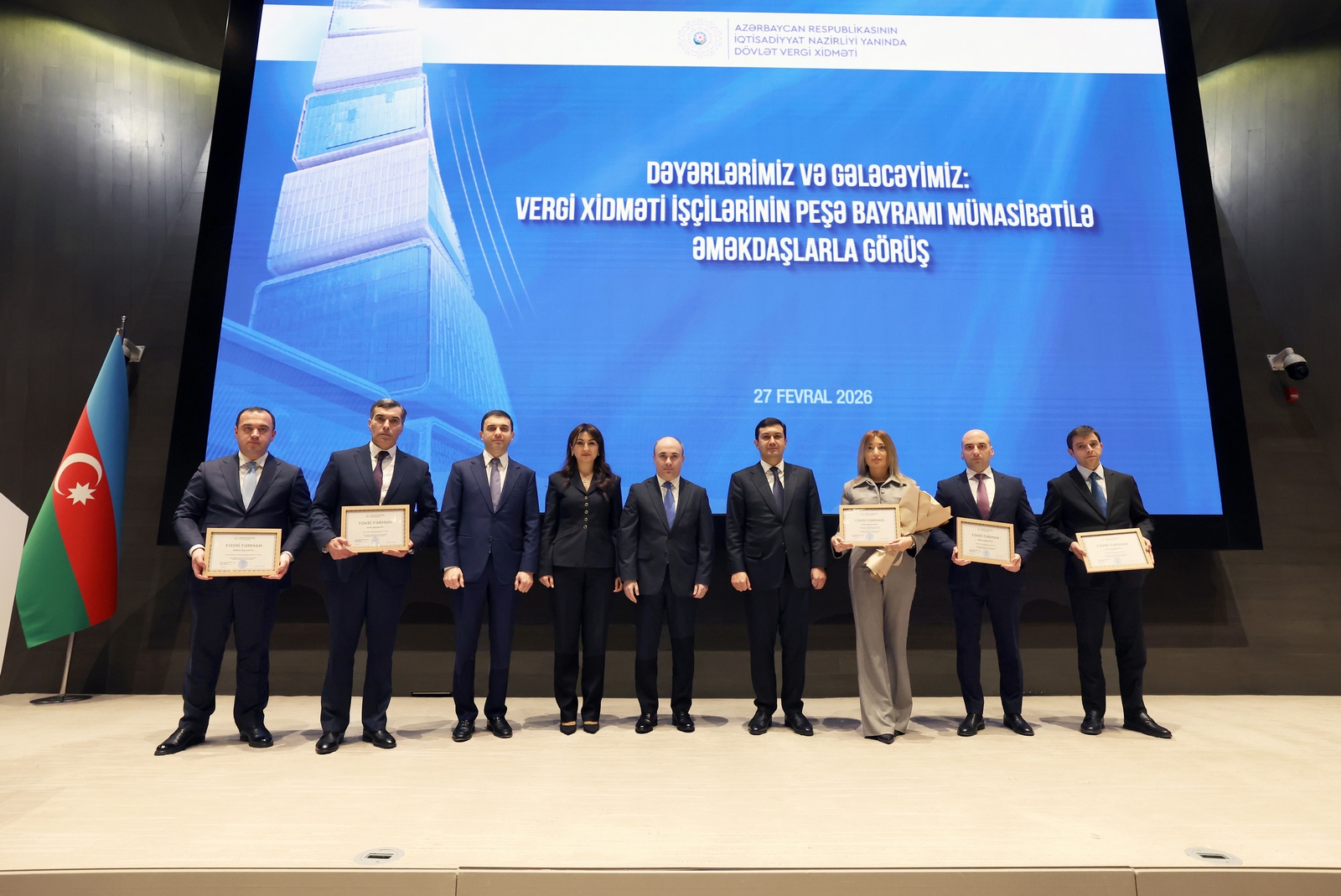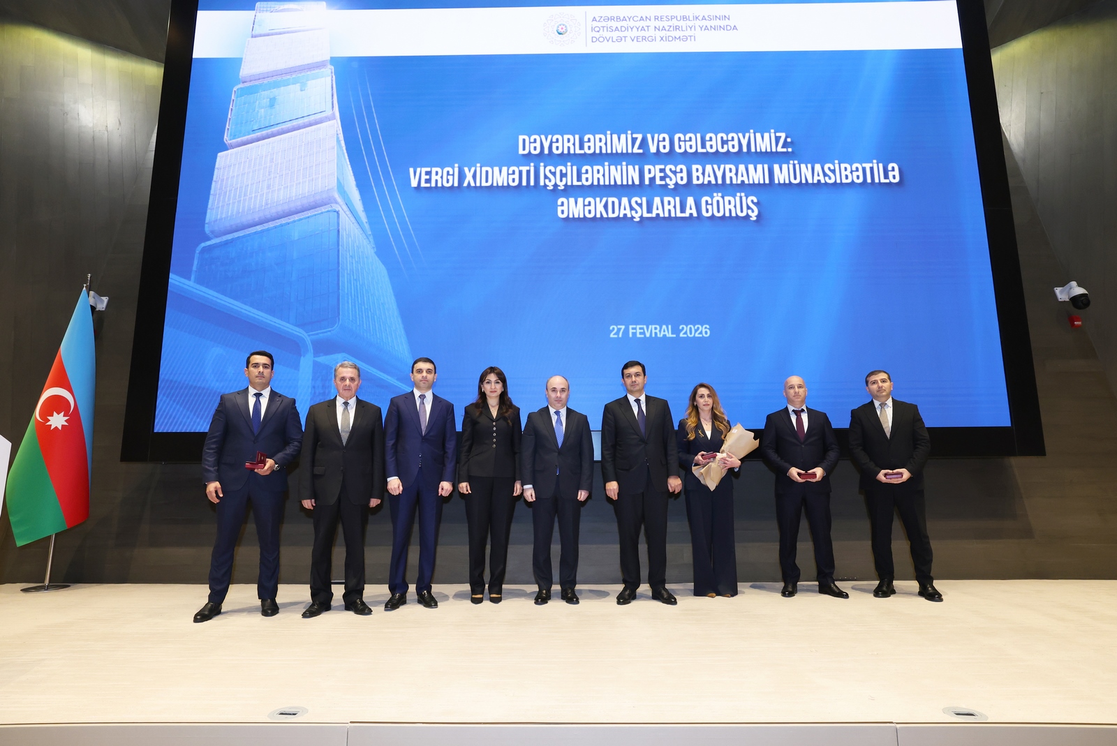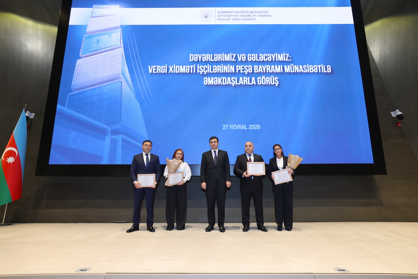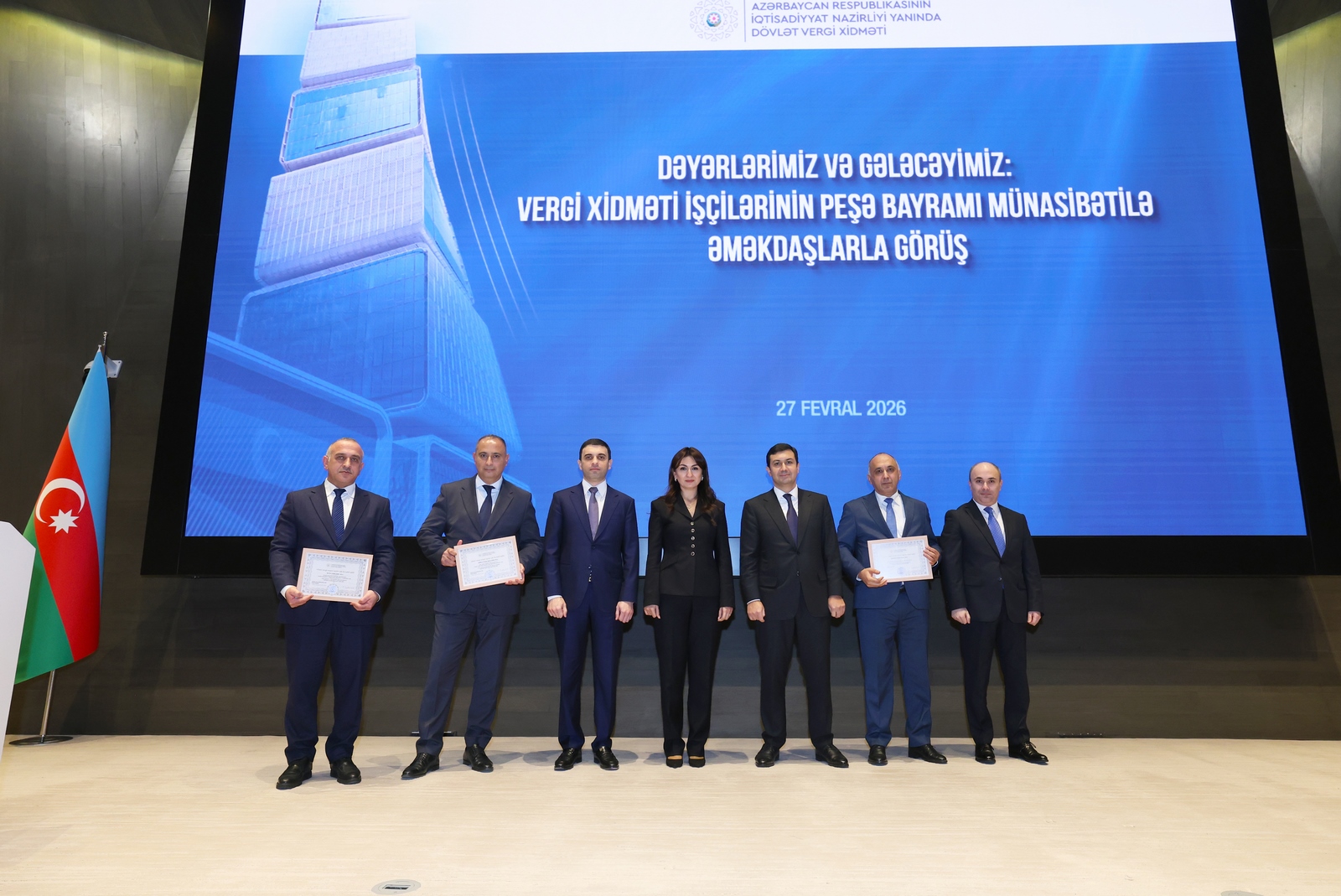 İqtisadiyyat Nazirliyi yanında Dövlət Vergi Xidmətində (DVX) 11 fevral – Vergi xidməti işçilərinin peşə bayramı münasibətilə təltif olunan əməkdaşlarla və gənc işçilərlə görüş keçirilib.