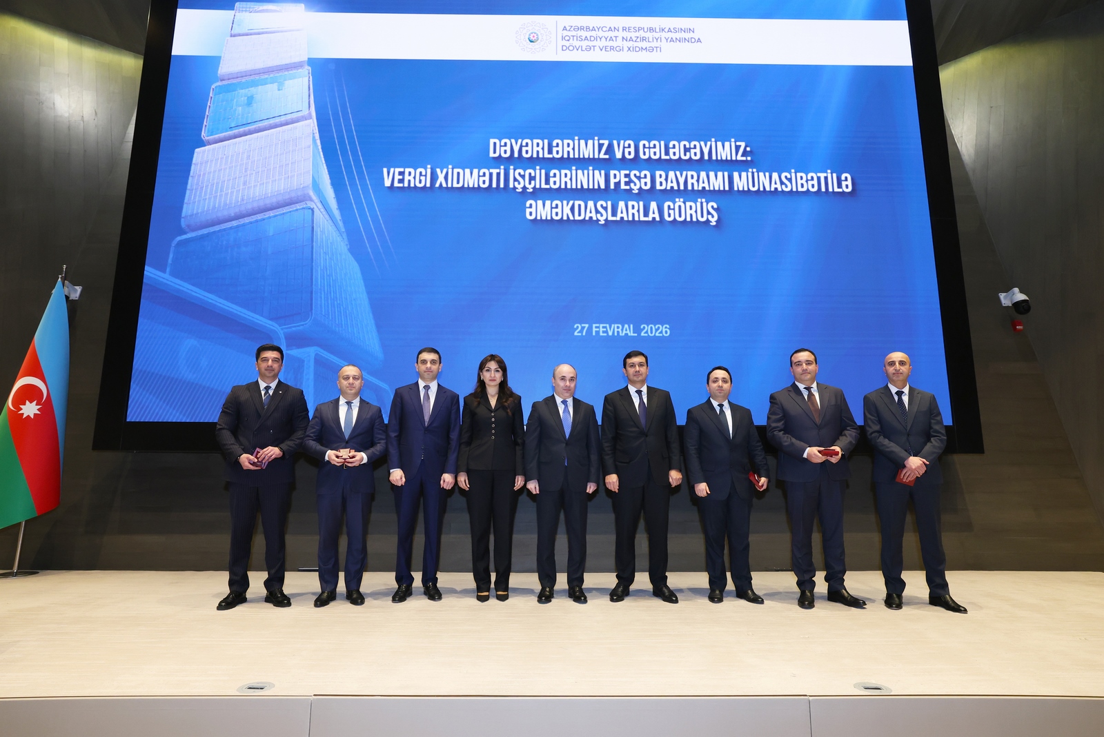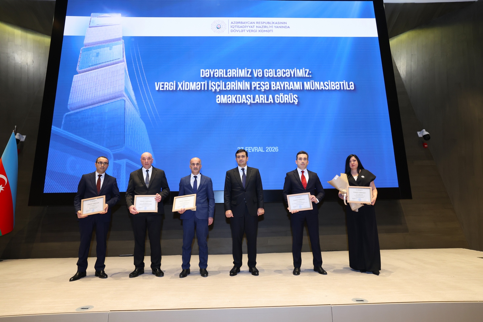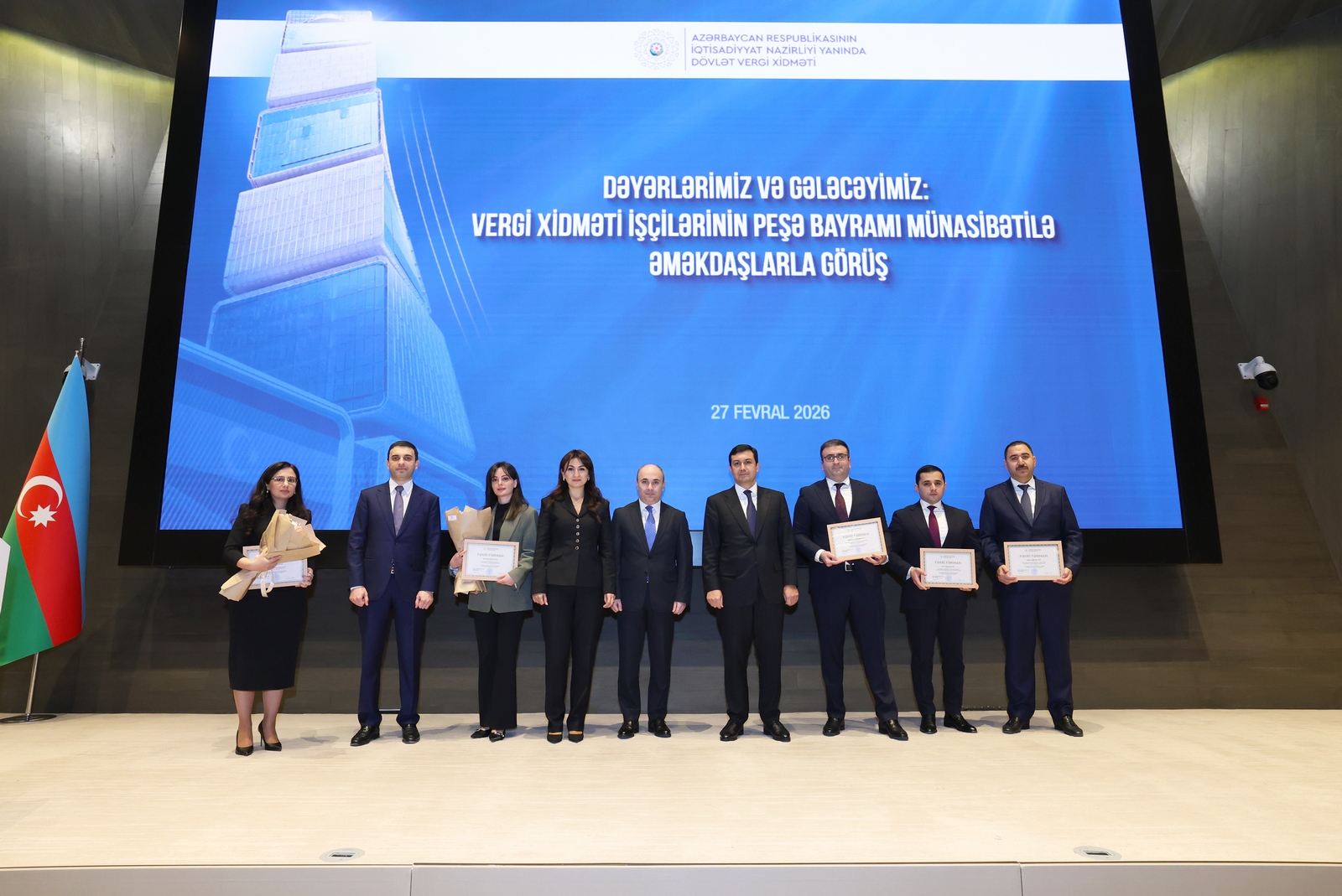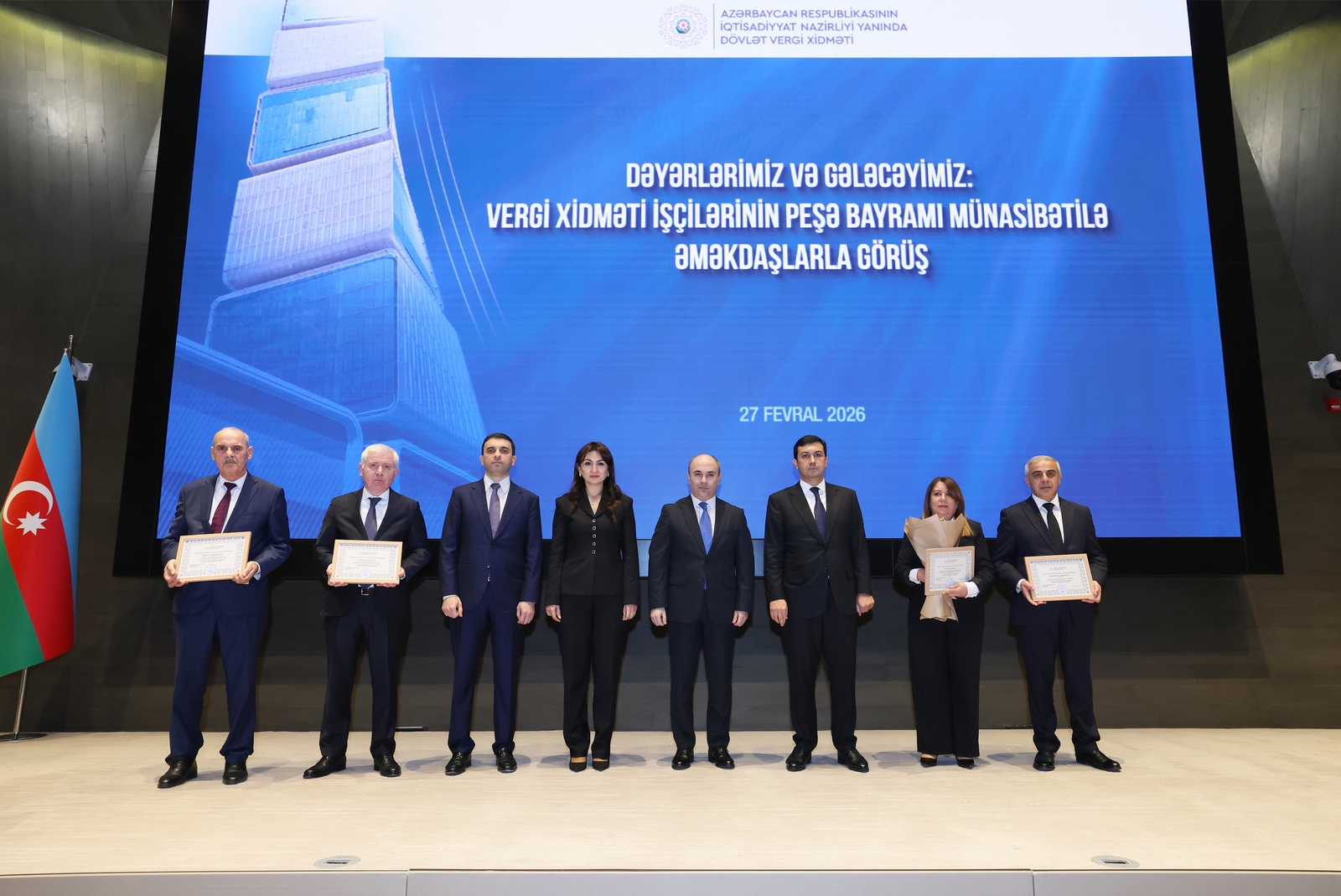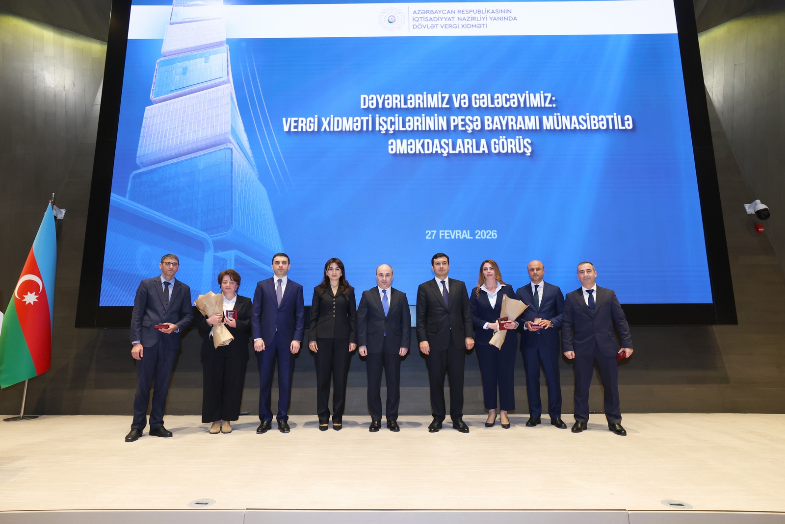 İqtisadiyyat Nazirliyi yanında Dövlət Vergi Xidmətində (DVX) 11 fevral – Vergi xidməti işçilərinin peşə bayramı münasibətilə təltif olunan əməkdaşlarla və gənc işçilərlə görüş keçirilib.
