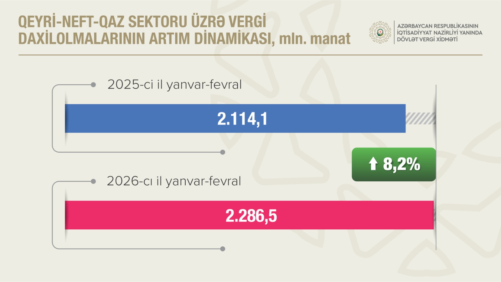 2026-cı ilin yanvar-fevral ayları ərzində İqtisadiyyat Nazirliyi yanında Dövlət Vergi Xidmətinin xəttilə dövlət büdcəsinə 3 milyard manatdan çox vergi daxil olub ki, bu da proqnozdan 79,4 milyon manat çoxdur. Qeyri-neft-qaz sektorundan vergi daxilolmaları 2 milyard 286,5 milyon manatdan çox olub və büdcəyə proqnozdan əlavə 69,6 milyon manat vəsait ödənilib. 2025-ci ilin müvafiq dövrünə nisbətən bu sektordan vergi daxilolmaları 172,4 milyon manat və ya 8,2 faiz artıb.