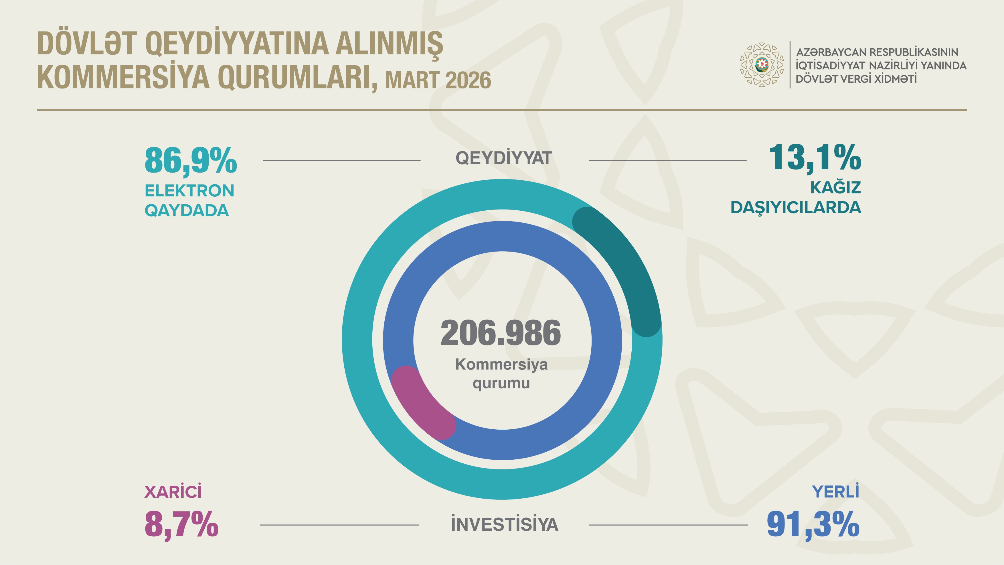 2026-cı ilin mart ayında 750 vahid kommersiya qurumu dövlət qeydiyyatından keçib. Onların 91,3 faizi yerli investisiyalı, 8,7 faizi isə xarici investisiyalı müəssisələrdir. Kommersiya qurumlarının 86,9 faizi elektron qaydada qeydiyyata alınıb. 2026-cı ilin yanvar-mart aylarında qeydiyyatdan keçmiş yerli investisiyalı məhdud məsuliyyətli cəmiyyətlərin e-qeydiyyatının xüsusi çəkisi isə 97,2 faiz təşkil edib.