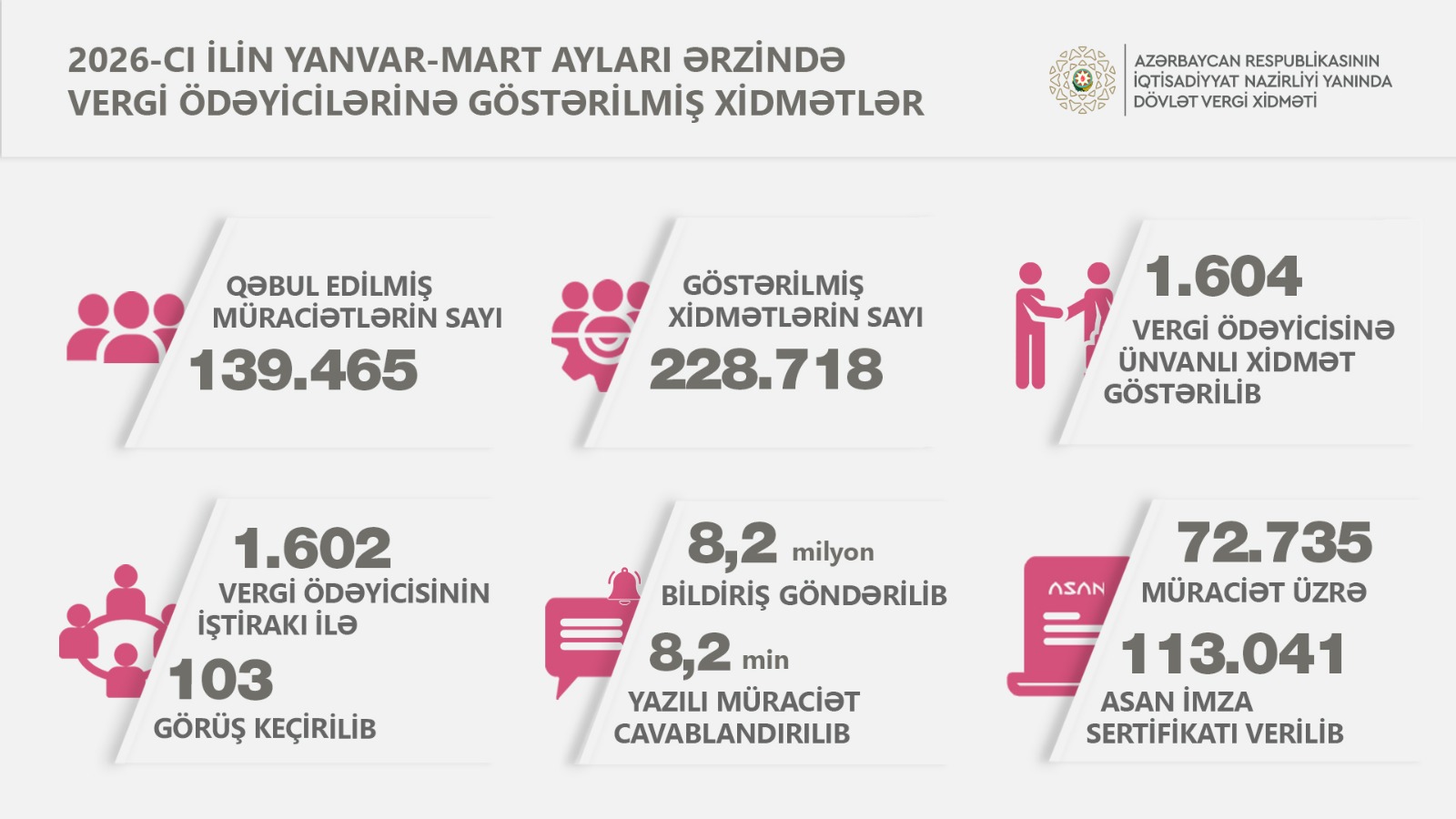 2026-cı ilin yanvar – mart ayları ərzində vergi ödəyicilərinə xidmət mərkəzlərində ümumilikdə 139.465 müraciət qəbul edilib. Həmin müraciətlər üzrə 228.718 sayda xidmət göstərilib.